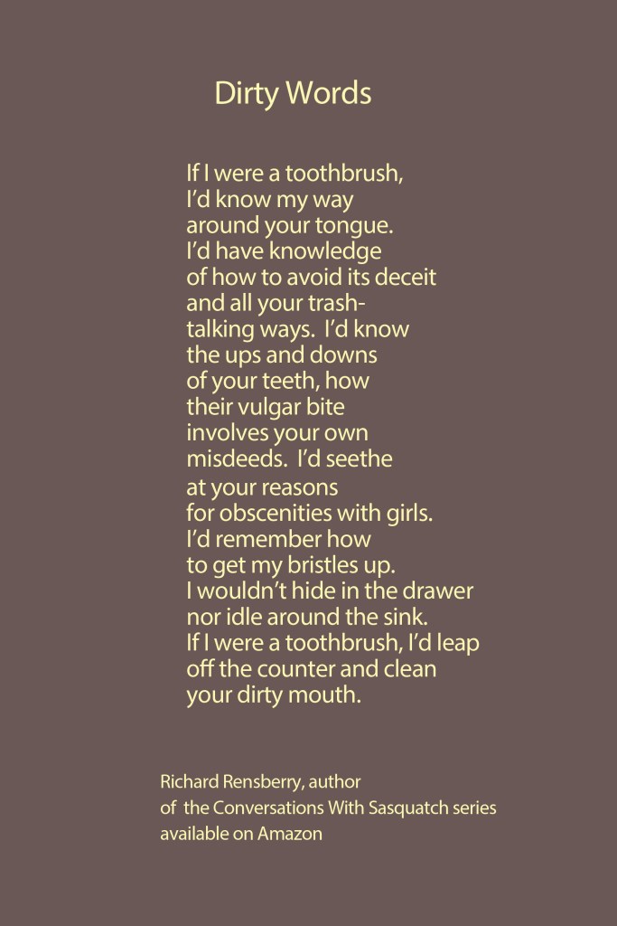 Bigfoot told me we look comical with our noses glued to a phone, with our ears attached to CNN and NBC. They told me Hollywood actors have fangs and forked tongues, the Internet is an illusion on which fools will feed. They told me, so I am telling you, we look comical with our noses glued to a phone.