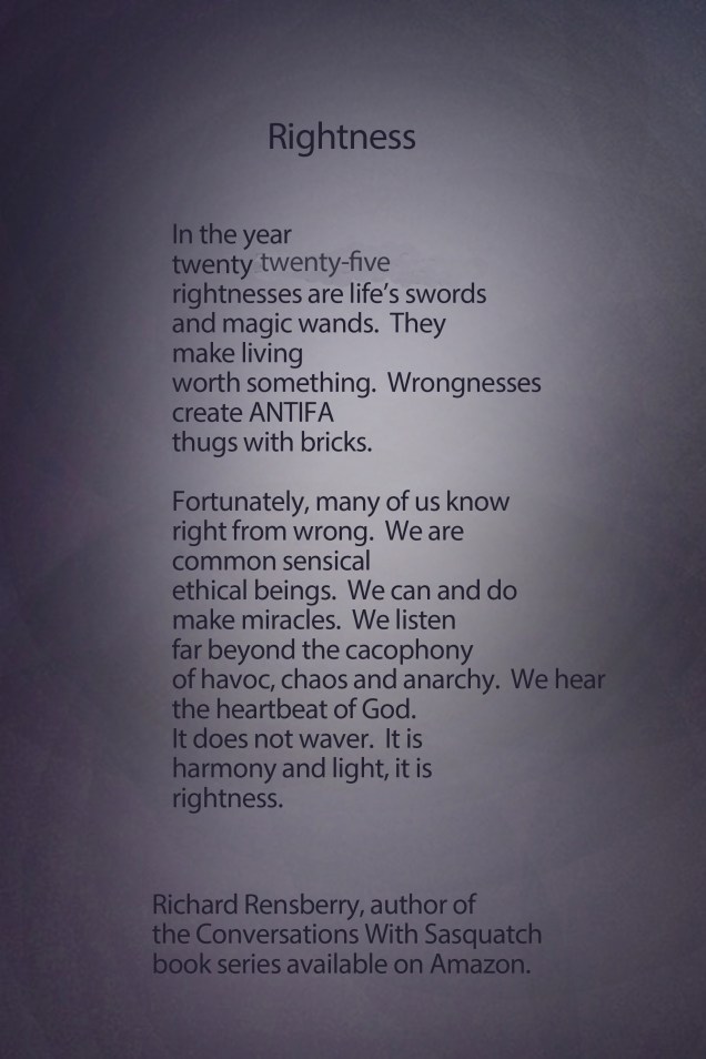 “I am not so sure you should be. You humans are blowing it. You are blind to the world of the Sasquatch. You have lost the memory and instinct of your body’s genes and the very essence of your immortal soul.”