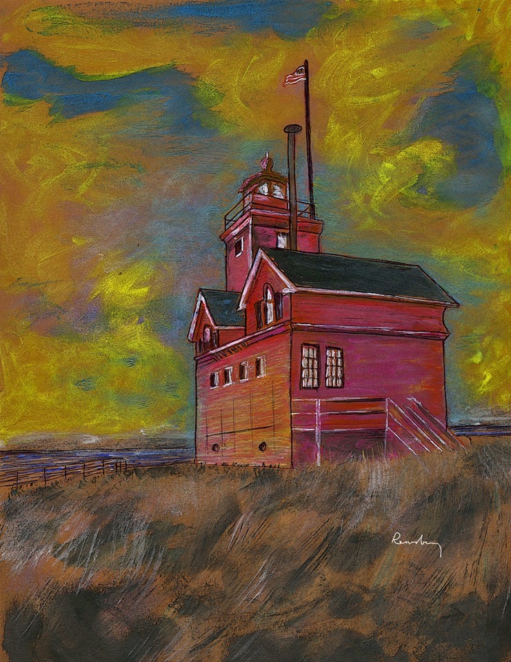 Pen and Ink from my lighthouse series of paintings. This is the Big Red Lighthouse in Holland, MI. I painted it on a piece of scrap paper salvaged from the grass and the wind.